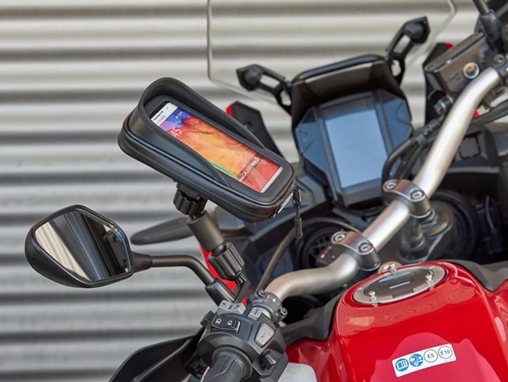 Univerzálny držiak na smartfón s uchytením na zrkadlo. Rozmer 180×90mm. Obsahuje bezpečnostný popruh, zosilnený vývod kábla a vnútorné vložky pre rôzne veľkosti telefónov. Držiak na smartfón kompatibilný so všetkými motocyklami. Rýchla a jednoduchá inštalácia na zrkadlo vďaka univerzálnemu montážnemu systému, nastaviteľnému aj v rukaviciach. Antireflexný štít, zosilnený vývod kábla a vnútorné vložky pre rôzne veľkosti telefónov. Vrátane bezpečnostného popruhu. Do veľkosti 180×90mm 6,6"