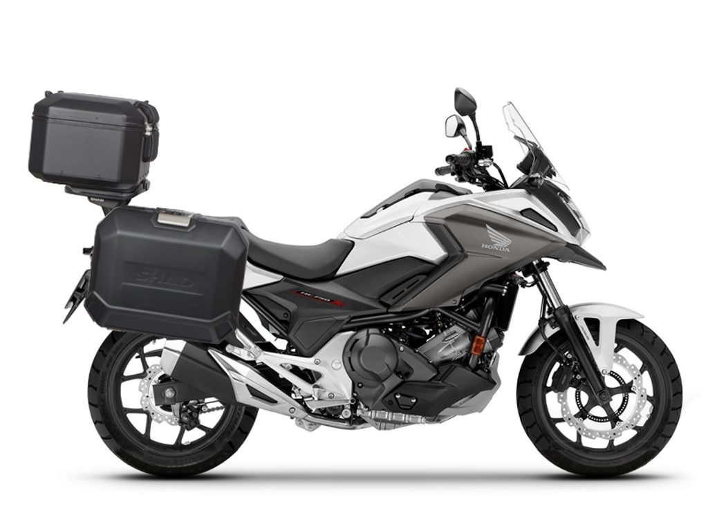 Kompletná sada čiernych hliníkových kufrov SHAD TERRA BLACK, 48 litrov vrchný kufor, 47/47 litrov bočné kufre, vrátane montážnej sady a platni SHAD HONDA NC 750 X