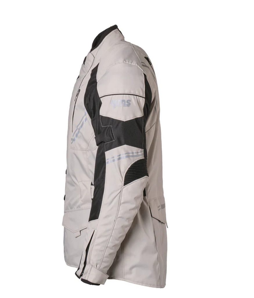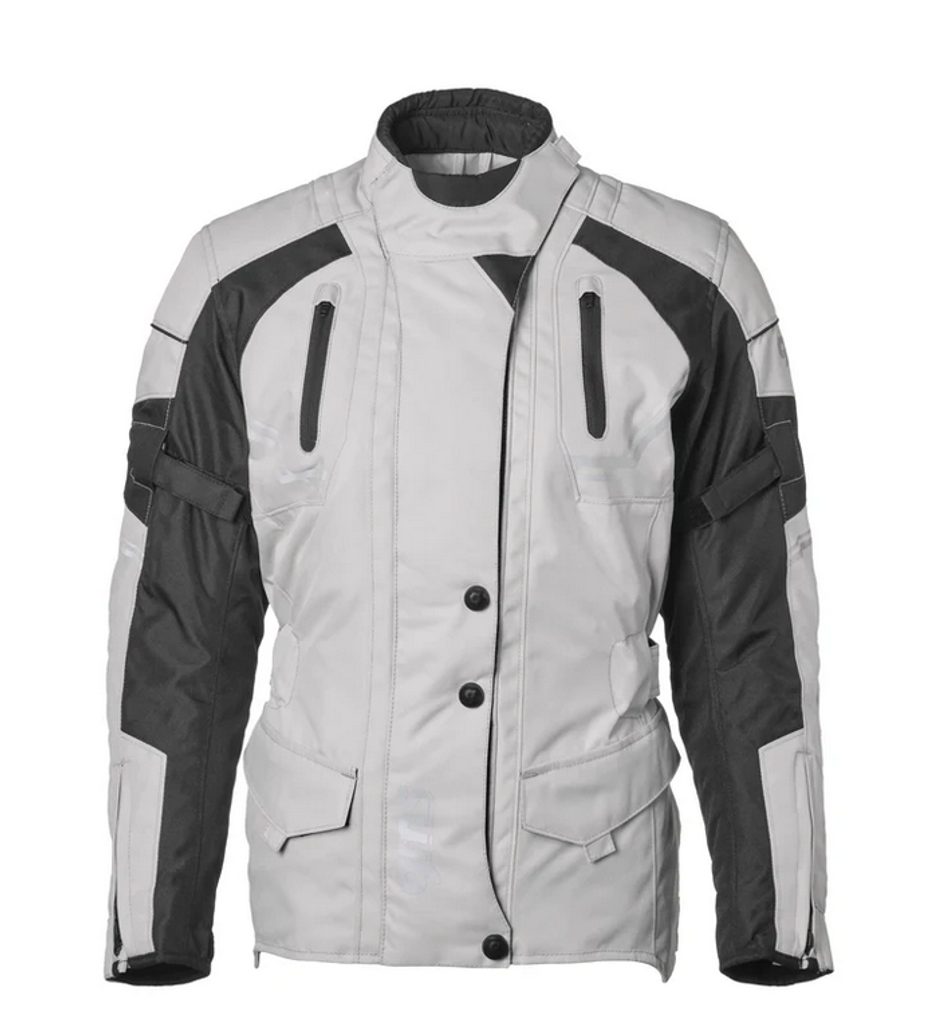 Moderná motocyklová bunda v neutrálnej béžovej farbe s civilným vzhľadom s laminovanou membránou GERMATEX® Z-Liner, vďaka čomu je nepremokavá a vetruodolná.